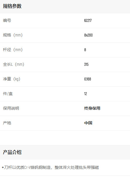 首頁>產(chǎn)品中心>螺絲批>一字螺絲批>世達A系列一字批8x200mm